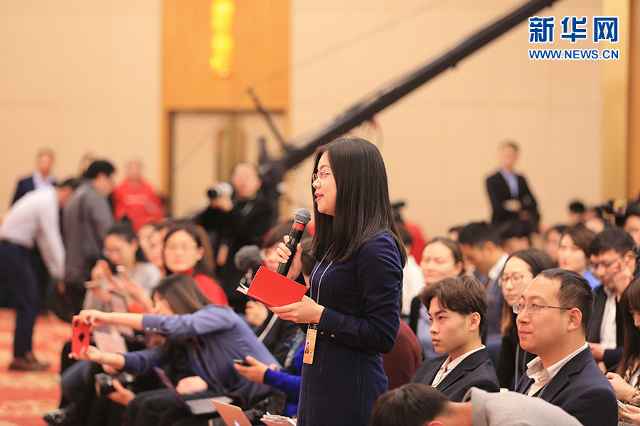 全國政協十三屆二次會議3月5日15:00在梅地亞中心多功能廳舉行記者會,邀請5位全國政協委員就“打贏防范化解重大風險、精準脫貧、污染防治三大攻堅戰”回答記者提問。圖為光明日報記者提問。新華網/中國政府網 陳杰 攝