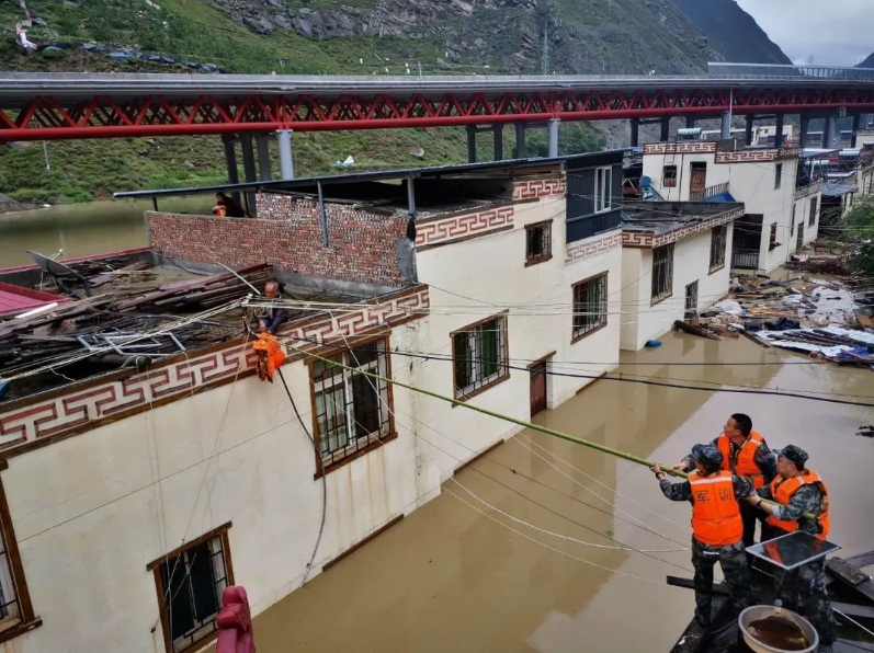 某地農村發生山洪泥石流災害 ,救援人員為受災群眾送去救生衣 余羌 攝