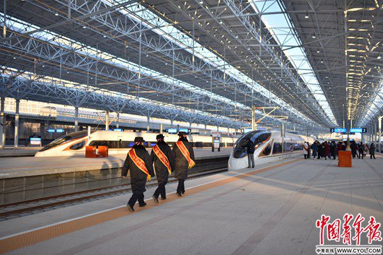 12月30日,北京至張家口高速鐵路開(kāi)通運(yùn)營(yíng),京張高鐵設(shè)計(jì)時(shí)速350公里,全線設(shè)北京北、清河、沙河(不辦理客運(yùn))、昌平、八達(dá)嶺長(zhǎng)城、東花園北、懷來(lái)、下花園北、宣化北、張家口10座車站。京張高鐵是我國(guó)首條智能化高速鐵路,也是2022年冬奧會(huì)的“門戶工程”。北京北站站臺(tái),三名站務(wù)人員走向一輛即將發(fā)車的京張高鐵列車。 實(shí)習(xí)生 宋欣然/攝