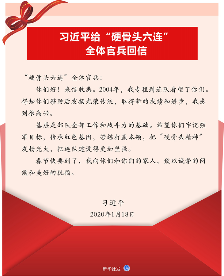 新華社北京1月19日電 中共中央總書記、國家主席、中央軍委主席習近平1月18日給74集團軍某旅“硬骨頭六連”全體官兵回信,勉勵他們牢記強軍目標,傳承紅色基因,苦練打贏本領,把“硬骨頭精神”發揚光大,把連隊建設得更加堅強,并向官兵們和他們的家人致以新春祝福?;匦湃娜缦拢?/p>