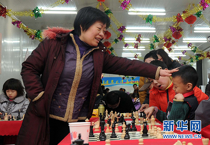 2014年2月4日,國際象棋世界冠軍謝軍(左)在龍?zhí)稄R會(huì)活動(dòng)現(xiàn)場與一位小朋友交流。(圖片來源:新華社 記者 公磊攝)