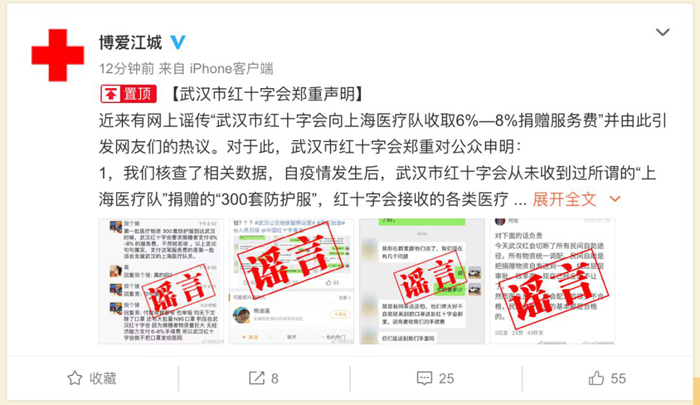 近來有網(wǎng)上謠傳“武漢市紅十字會向上海醫(yī)療隊收取6%—8%捐贈服務費”并由此引發(fā)網(wǎng)友們的熱議。對于此,武漢市紅十字會鄭重對公眾申明: