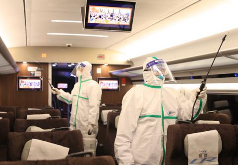 2月4日,中國鐵路北京局集團有限公司對返回北京動車段的復興號進行車內消毒作業(yè)。張晴/攝