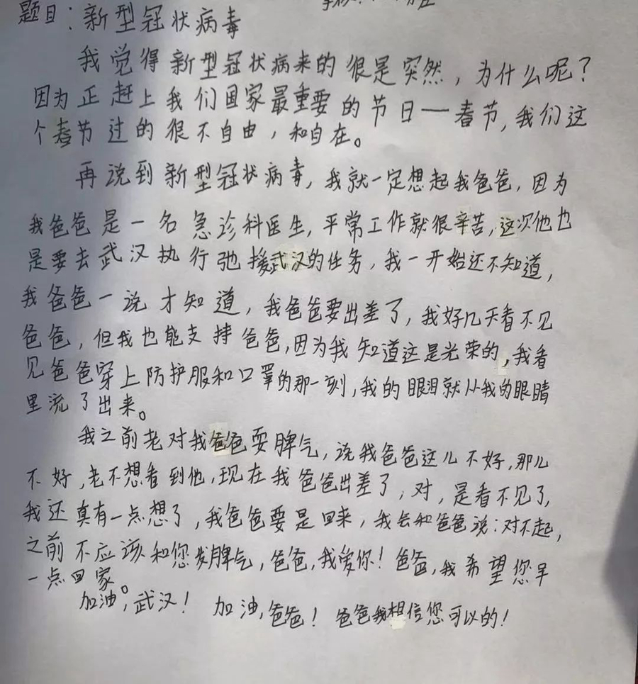 信里他先反思了一下自己,說以前盼望著爸爸上班,不希望爸爸在家管他。現在爸爸去前線,我想到危險性,現在又特別希望爸爸安安全全地回家,然后還說了一句,爸爸我愛你!以前從來沒有過。我跟他說,我希望你在生活和學習中面對困難,無所畏懼,一直向前,我還說爸爸不一定是你的驕傲,但一定要做你的榜樣。