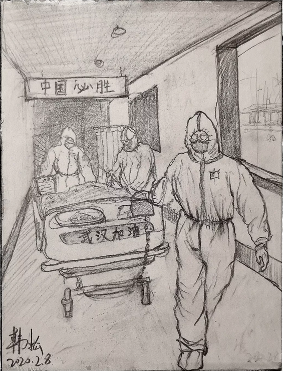 素描畫《一方有難,八方支援!》作者:中央芭蕾舞團燈光設計 周杉行也