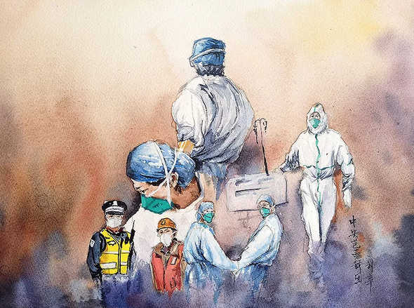 水彩畫《隔離疫情 不隔離愛》作者:中央芭蕾舞團舞美設計 劉辛