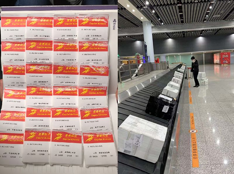 2月5日,首架貨機從西班牙馬德里(CA1026次航班)出發(fā),于當(dāng)天早上7:40分抵達了河南新鄭國際機場。在這架飛機上,載滿了口罩、護目鏡、防護服、消毒液等疫情急需物資,總計18個托盤,約5噸,371336件,總價值人民幣377450元。