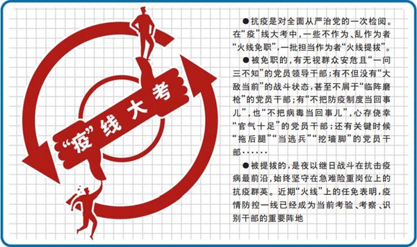 疾風知勁草,烈火見真金。疫情還是檢驗黨性的試金石,歷練擔當的磨刀石,辨識作風的照妖鏡,管窺初心的望遠鏡。一批敢挑重擔、沖鋒在前的英雄脫穎而出;一批作風漂浮、失職失責的干部“火線免職”。