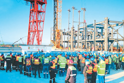 2月10日,胡努特魯燃煤電廠項目舉行防疫期間安全施工會。國家電投供圖
