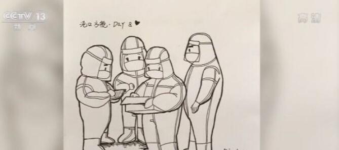 我自己,這是在太陽下面曬太陽。第6天的時候就開始畫醫護人員,這是他們教我們做操,這是我們這邊的保潔人員,保潔人員在噴灑消毒藥水,我就是先把他們的一些平時的工作狀態先拍下來,拍下來以后我就剪輯成一個小視頻,根據里面的每一段,把它節選出來,畫一個定格的漫畫。