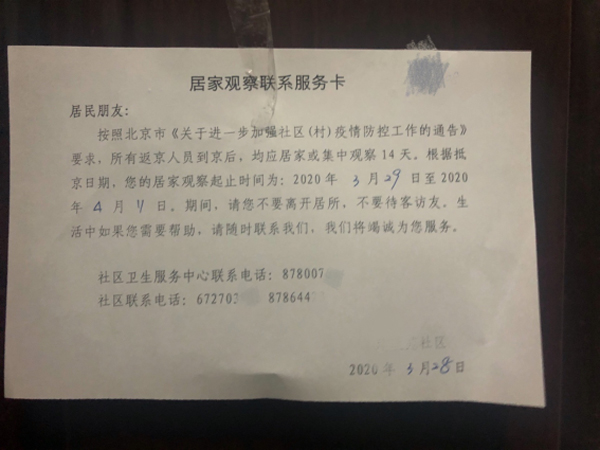 8、交接:車輛到達社區(qū)后,隨行的街道干部同社區(qū)工作人員進行交接。返京人員在測量體溫、簽署《居家觀察個人告知書》等文件后,由社區(qū)工作人員送至家中。居家觀察的14天內(nèi),將嚴格禁止外出、會客等行為,由社區(qū)安排專人幫助解決生活困難。