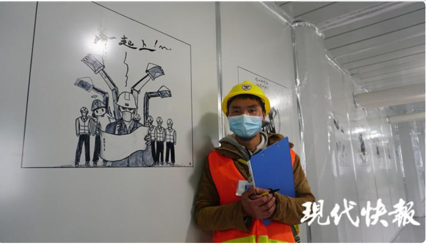 許新焰看到醫護人員通道的一面墻空著,就用一組漫畫,把中建三局建設醫院對抗 " 疫魔 " 的過程,用9幅漫畫體現出來。" 就是想給醫護人員、志愿者和我們這些維保隊員力量,我們用幾天時間就把醫院建起來了,這樣的速度,不怕疫魔。" 他說,每幅漫畫大約需要耗費一兩個小時,有時畫著畫著就要出工,前前后后花了七八天的時間,才把整組漫畫全部畫完。