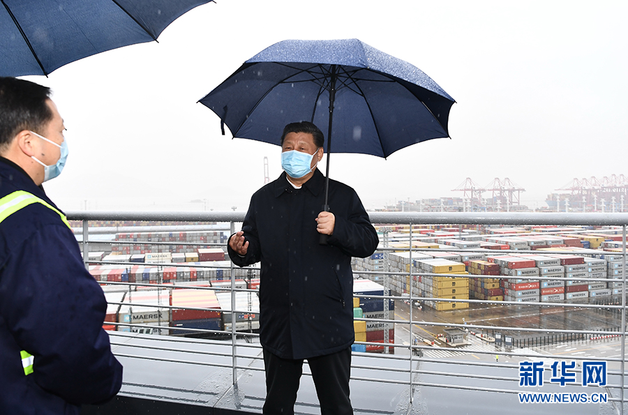 3月29日,中共中央總書記、國家主席、中央軍委主席習近平在浙江考察調研。這是習近平在寧波舟山港穿山港區(qū)碼頭了解港口復工復產情況。 新華社記者 申宏 攝