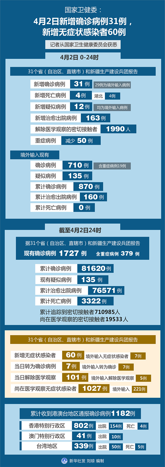 截至4月2日24時,據31個省(自治區、直轄市)和新疆生產建設兵團報告,現有確診病例1727例(其中重癥病例379例),累計治愈出院病例76571例,累計死亡病例3322例,累計報告確診病例81620例,現有疑似病例135例。累計追蹤到密切接觸者710985人,尚在醫學觀察的密切接觸者19533人。