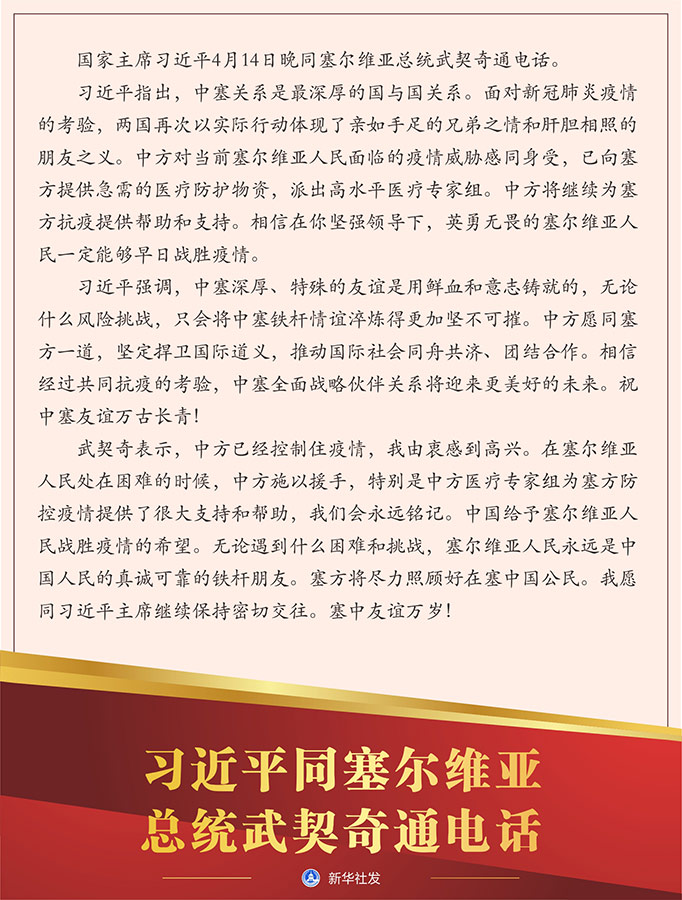 習(xí)近平指出,中塞關(guān)系是最深厚的國(guó)與國(guó)關(guān)系。面對(duì)新冠肺炎疫情的考驗(yàn),兩國(guó)再次以實(shí)際行動(dòng)體現(xiàn)了親如手足的兄弟之情和肝膽相照的朋友之義。中方對(duì)當(dāng)前塞爾維亞人民面臨的疫情威脅感同身受,已向塞方提供急需的醫(yī)療防護(hù)物資,派出高水平醫(yī)療專(zhuān)家組。中方將繼續(xù)為塞方抗疫提供幫助和支持。相信在你堅(jiān)強(qiáng)領(lǐng)導(dǎo)下,英勇無(wú)畏的塞爾維亞人民一定能夠早日戰(zhàn)勝疫情。