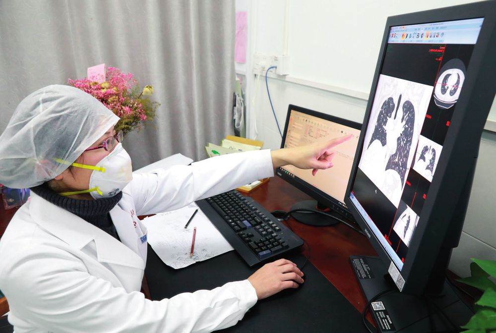 2月5日,武漢大學中南醫院醫學影像科副主任張笑春在她的研究室查看新冠肺炎患者的 CT 影像高翔攝 / 本刊