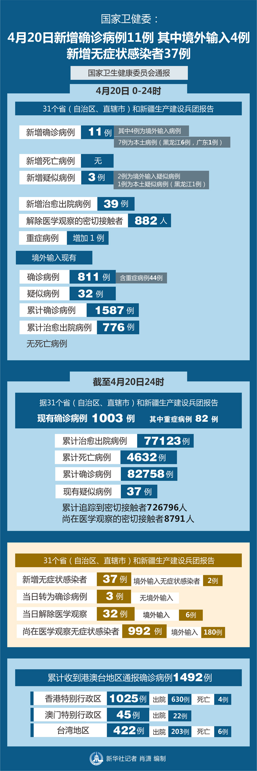 新華社北京4月21日電(記者白瀛、王秉陽)國家衛健委21日通報,4月20日0—24時,31個省區市和新疆生產建設兵團報告新增確診病例11例,其中4例為境外輸入病例,7例為本土病例(黑龍江6例,廣東1例);無新增死亡病例;新增疑似病例3例,其中2例為境外輸入疑似病例,1例為本土疑似病例(黑龍江1例)。
