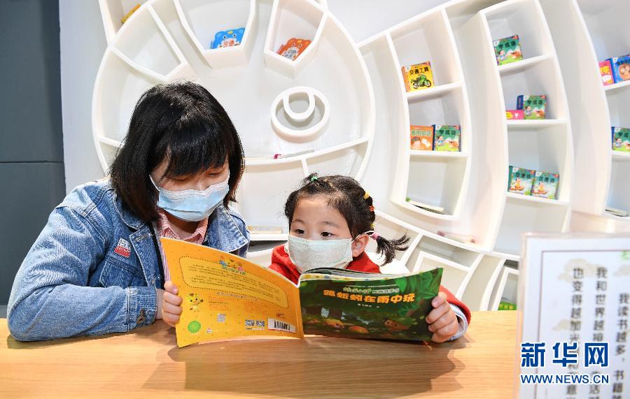 4月22日,一對母女在湖北省襄陽市保康縣一家書店內(nèi)閱讀少兒讀物。新華社發(fā)(陳泉霖 攝)