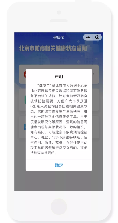 “健康寶”是北京市大數(shù)據(jù)中心依托北京市防疫相關(guān)數(shù)據(jù)和國家政務(wù)服務(wù)平臺相關(guān)功能,針對當(dāng)前新冠肺炎疫情防控需要,方便廣大市民及進(返)京人員查詢自身防疫相關(guān)健康狀態(tài),幫助城市恢復(fù)生產(chǎn)生活秩序,推出的一項數(shù)字化信息服務(wù)工具。