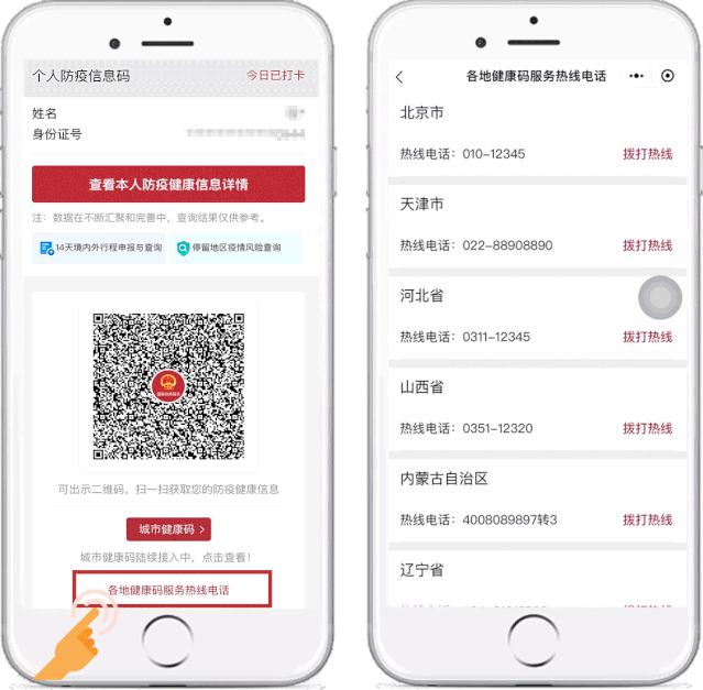 現(xiàn)在,在防疫信息碼的亮碼頁增加了“各地健康碼服務(wù)熱線電話”,用戶可通過服務(wù)熱線咨詢健康碼使用問題。