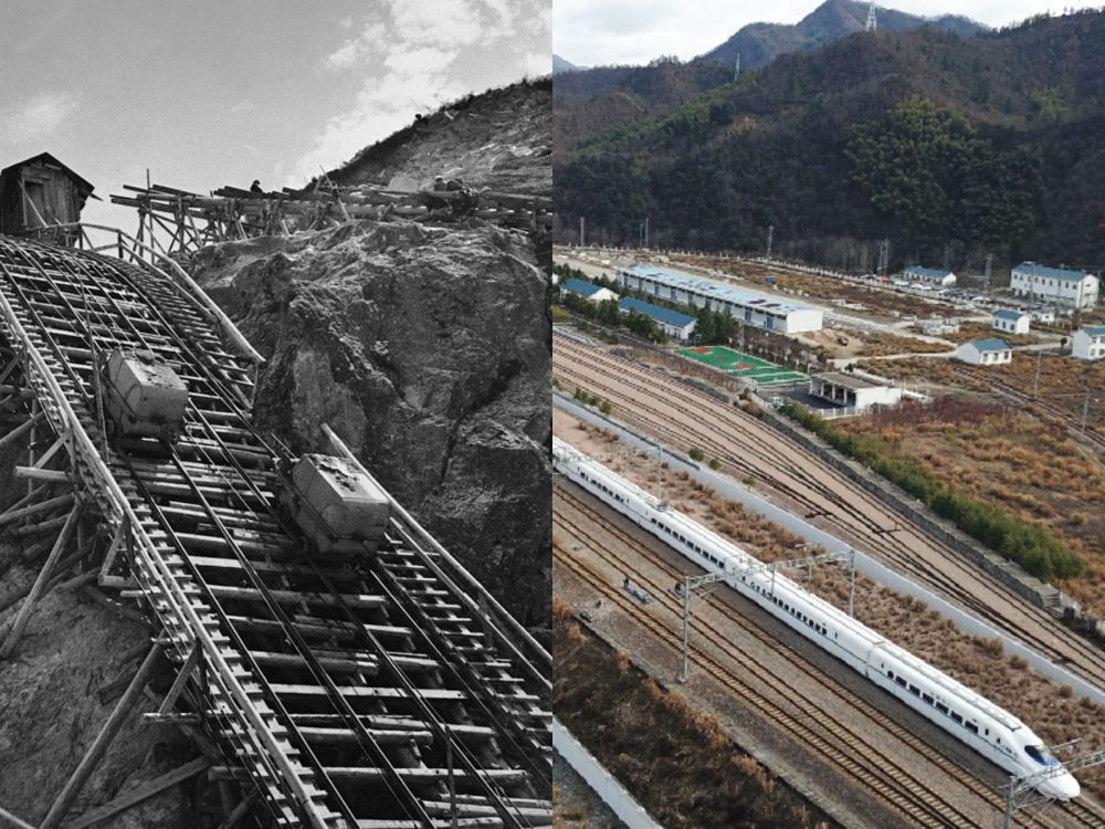 (左圖:1957年金寨響洪甸水庫工地上吊車運送混凝土,新華社稿王永嘉攝;右圖:2019年高鐵駛出金寨火車站。新華社記者張端攝)