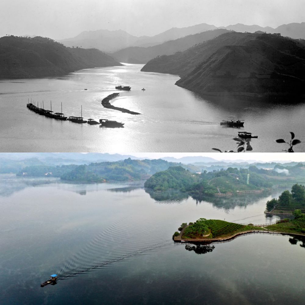 ?。ㄉ蠄D:1976年金寨的水庫,新華社記者成大林?jǐn)z;下圖:2019年水庫之上是茶谷。新華社記者陶明攝)