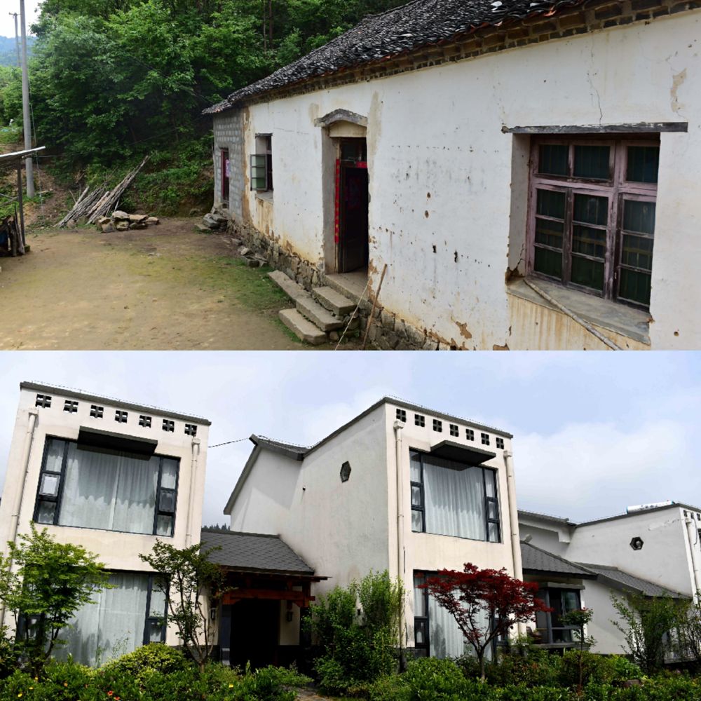 ?。ㄉ蠄D:大灣村村民曾經(jīng)的住房;下圖:大灣村易地扶貧安置點的新住房。新華社記者劉軍喜攝)