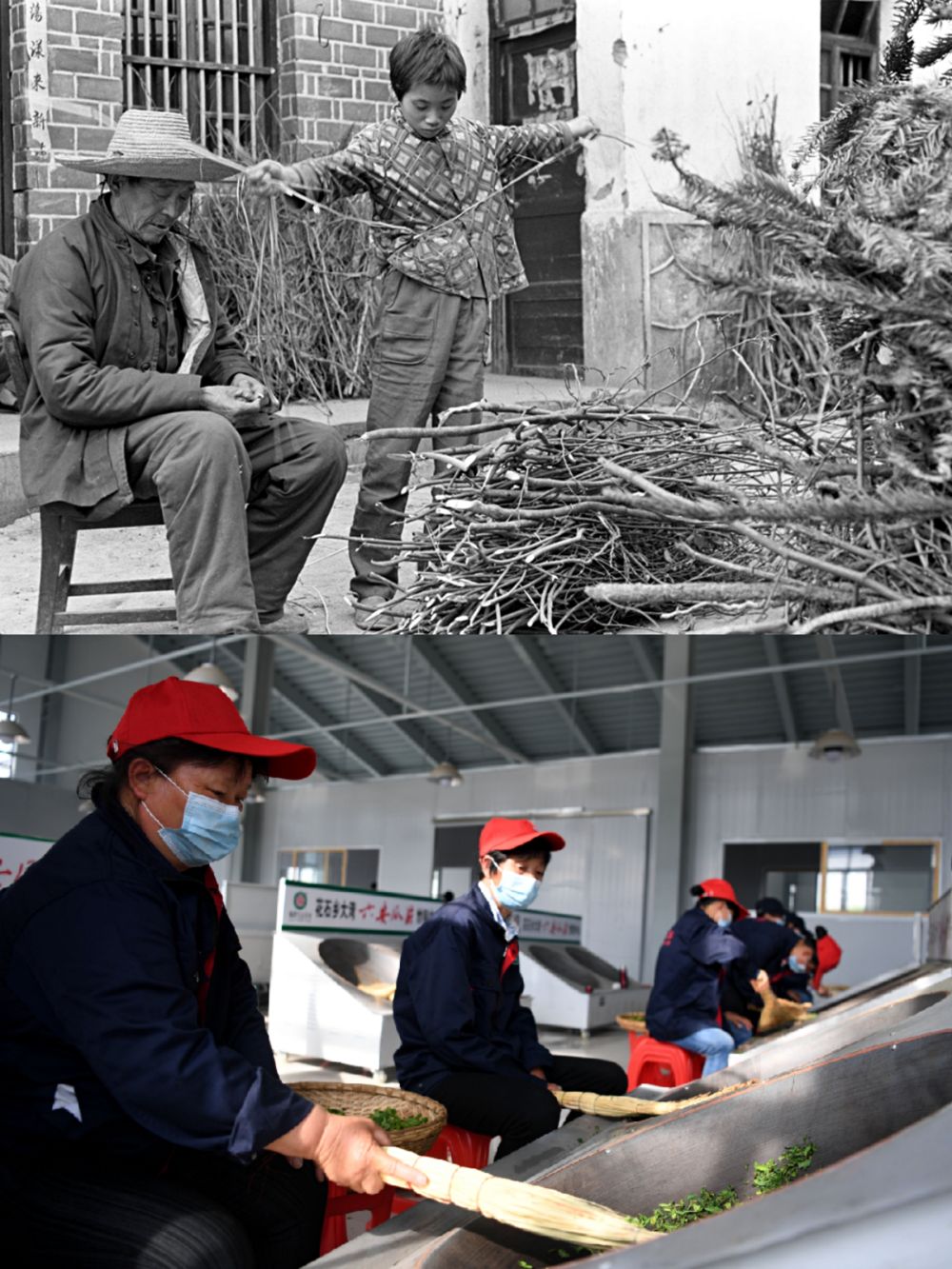 ?。ㄉ蠄D:過去金寨人守著柴火過日子,新華社記者張曙光攝;下圖:2020年4月16日,大灣村村民在金寨縣花石鄉(xiāng)茶產(chǎn)業(yè)扶貧車間里加工茶葉。新華社記者劉軍喜攝)