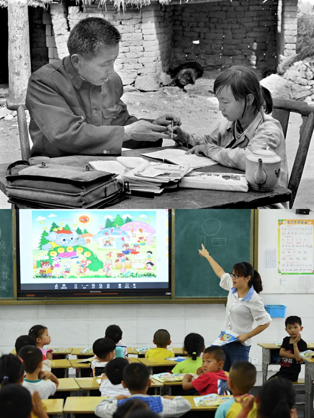 ?。ㄉ蠄D:1991年5月,金寨縣希望小學(xué)老師胡遵訓(xùn)跑20多里山路為學(xué)生胡亞麗補課,新華社記者張曙光攝;下圖:2019年9月3日,金寨縣希望小學(xué)南校區(qū)學(xué)生通過多媒體上課。新華社記者劉軍喜攝)