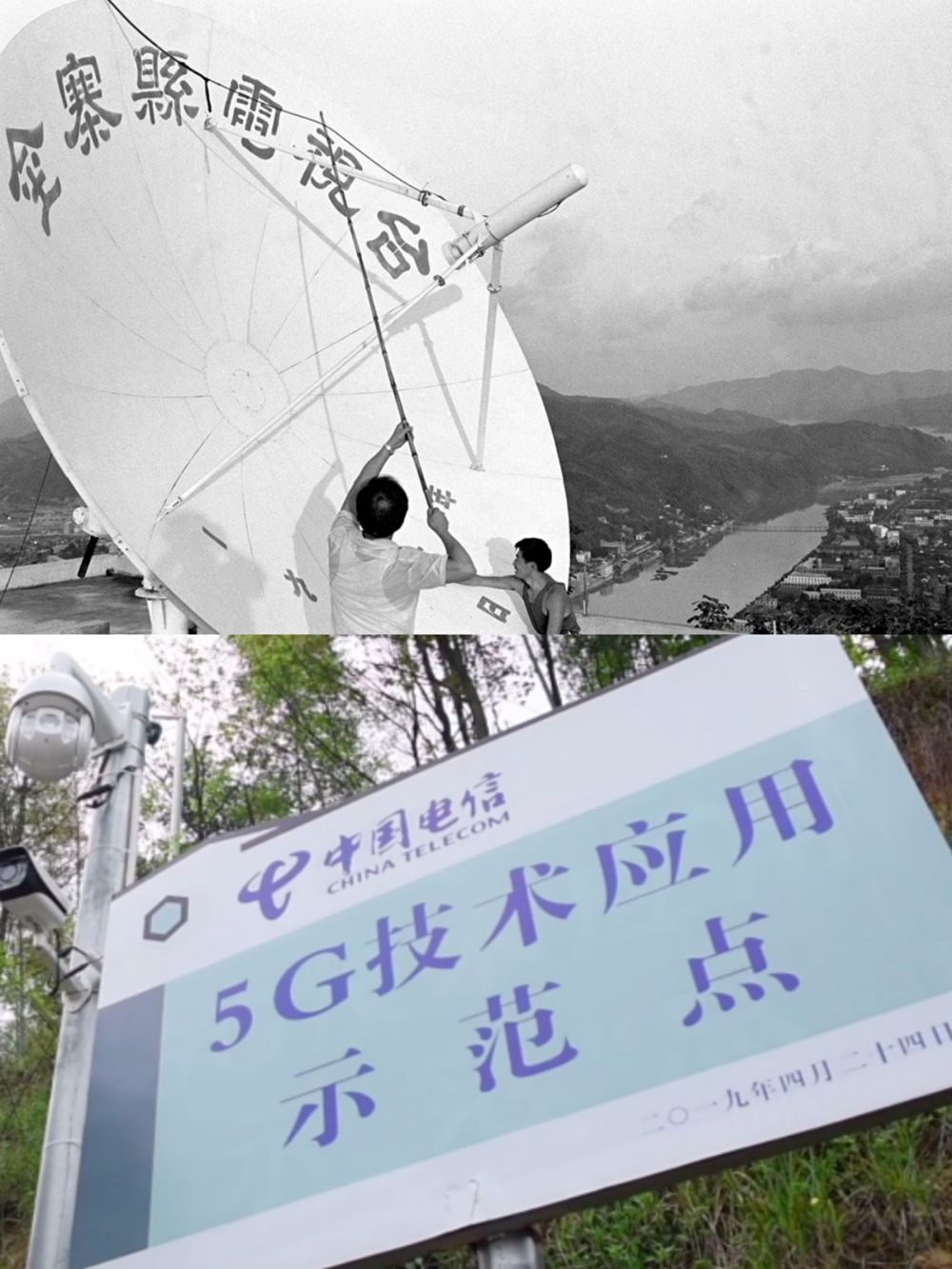 (上圖:1987年,金寨縣建成梅山地面衛(wèi)星接收站,新華社記者李錦攝;2019年,大灣村開通5G信號。新華社記者湯陽攝)