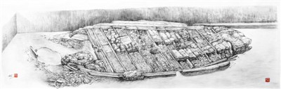 早期的考古現(xiàn)場(chǎng)都會(huì)采用帶有透視方法的素描速寫方法進(jìn)行現(xiàn)場(chǎng)記錄。半坡遺址、廣州南越王墓考古現(xiàn)場(chǎng)都曾專門請(qǐng)畫家到現(xiàn)場(chǎng)繪制素描圖。此圖繪制于2015年12月。作為現(xiàn)場(chǎng)發(fā)掘的參與者,作者負(fù)責(zé)現(xiàn)場(chǎng)測(cè)繪和畫圖的工作,每天都留意著沉船隨著發(fā)掘進(jìn)度而產(chǎn)生的變化。