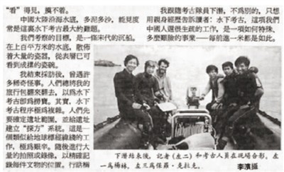 1990年定海水下考古培訓(xùn)時(shí),記者(照片左二)也曾下水,設(shè)法近距離觀察遺址狀況和隊(duì)員們的工作。崔勇(照片右一)是記者在水下的守護(hù)人之一。人民日?qǐng)?bào)海外版也是最早詳細(xì)報(bào)道中國(guó)水下考古事業(yè)發(fā)展的新聞媒體。 (本報(bào)資料照片)