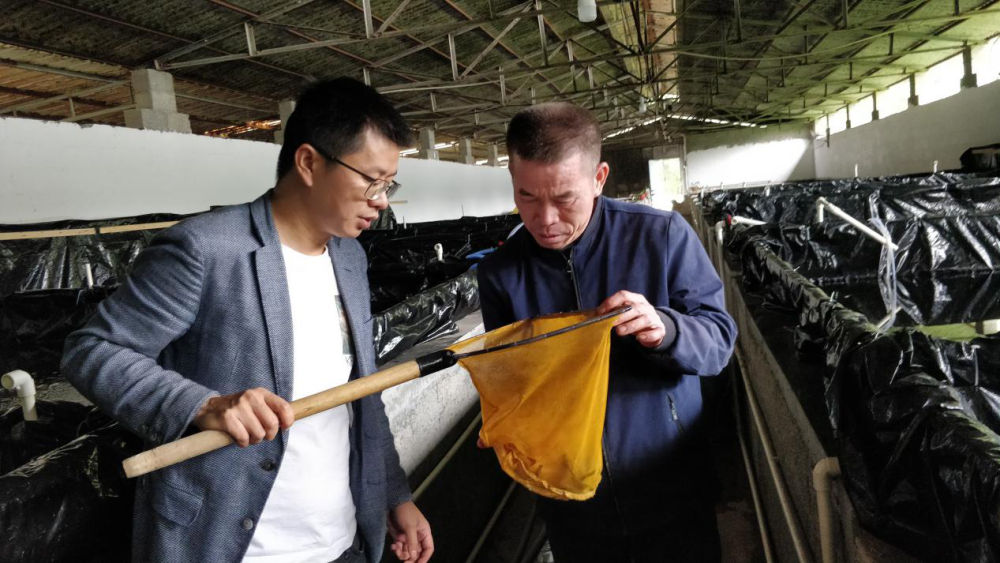 廣西上林縣西燕鎮(zhèn)岜獨(dú)村駐村第一書記康勇(左一)在龜鱉養(yǎng)殖場(chǎng)和養(yǎng)殖能人交流(4月24日攝)。新華社記者 農(nóng)冠斌 攝