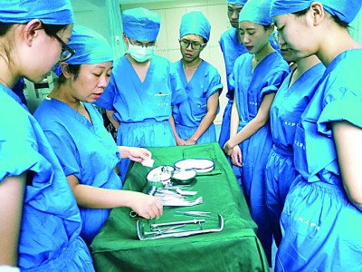 手術(shù)的順利進展離不開器械護士的準確傳遞。圖為北京大學(xué)護理學(xué)院學(xué)生正在老師引導(dǎo)下認識手術(shù)器械。李珂攝/光明圖片