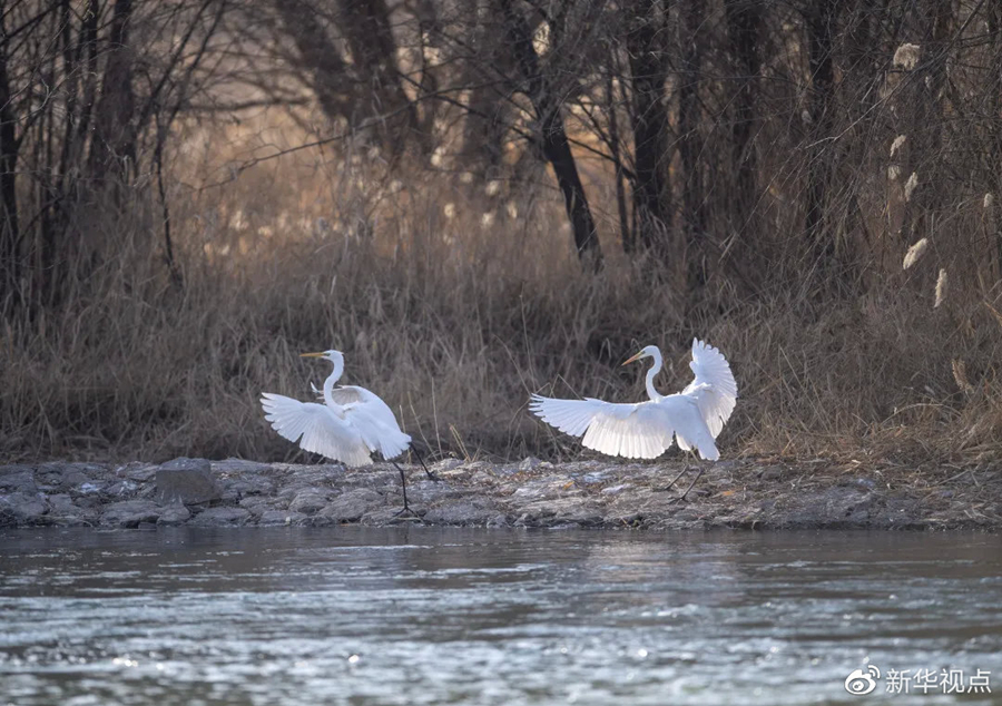 白鷺在汾河濕地公園內嬉戲 新華社記者楊晨光攝
