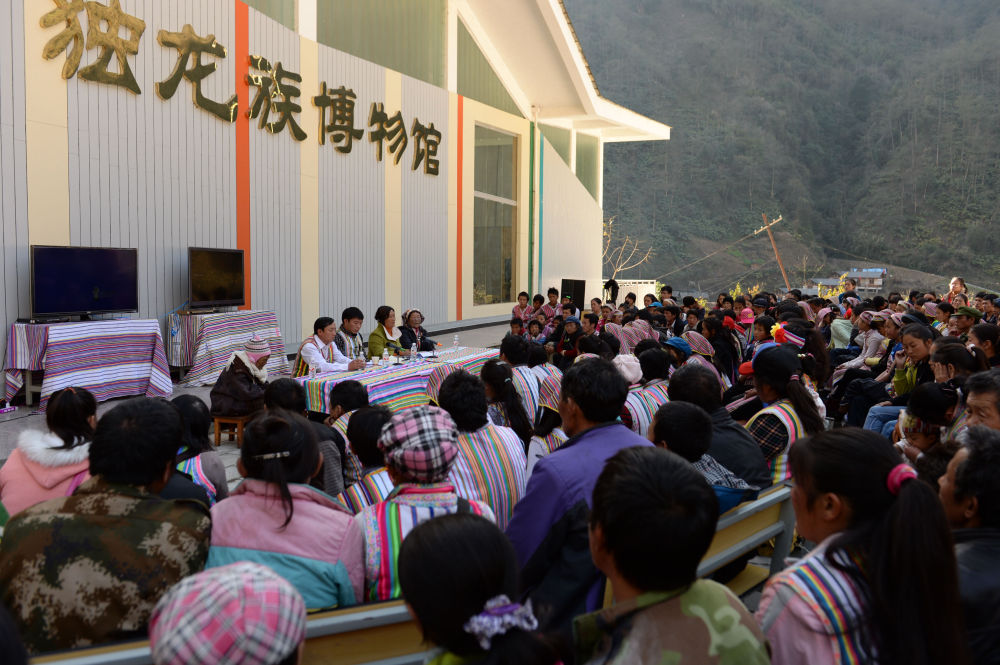 受到習近平總書記會見的貢山縣干部群眾代表回到獨龍江鄉,在新修起的獨龍族博物館前用漢語和獨龍語向數百名獨龍族群眾宣講總書記的講話內容(2015年1月22日攝)。新華社記者 胡超 攝