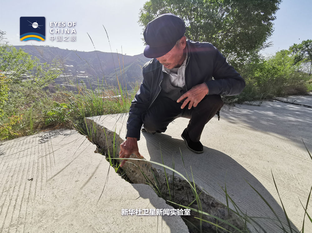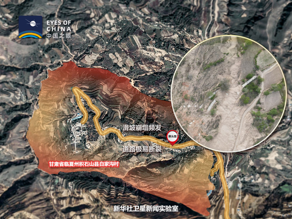 白家溝村地處濕陷性黃土滑坡帶。從衛星看,整個村子山峰陡峭,基巖裸露,難以找到一塊成片的平地。人只能見縫插針式地居住在疏松、干裂的黃土地上。一條崎嶇的路像絲帶一樣“搭”在懸崖峭壁上,隨時有掉下來的危險。