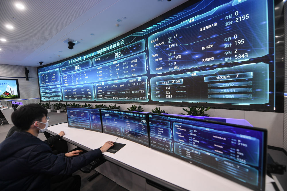 4月2日,在杭州市余杭區疫情防控工作領導小組指揮部內,杭州城市大腦精密智控防疫系統顯示疫情防控動態各項實時數據。新華社記者 徐昱 攝