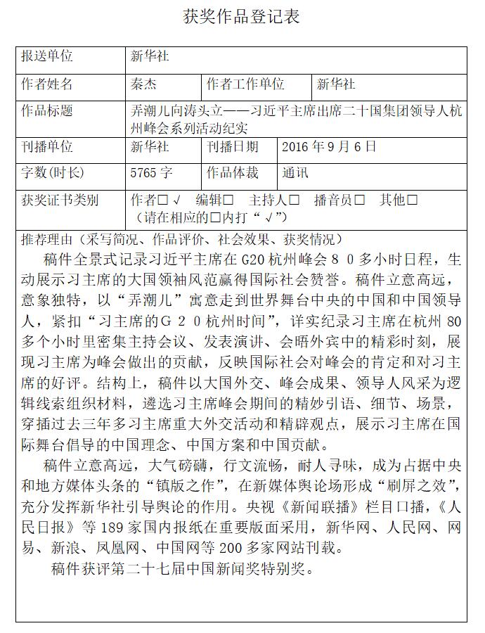 秦杰同志長期承擔中央主要領導同志的采訪報道任務。無論在條件艱苦的青藏高原,還是在行程萬里日程頻密的高訪之中,他都能不辭辛苦、日夜奮戰,以高度的政治責任感和精益求精的職業精神出色完成任務。他參與采寫的《更高舉起改革開放偉大旗幟——寫在鄧小平同志誕辰110周年之際》和牽頭采寫的《弄潮兒向濤頭立——習近平主席出席二十國集團領導人杭州峰會系列活動紀實》獲得中國新聞最高獎——中國新聞獎特別獎,參與撰寫的《中共高層新陣容》被譽為中國領導人對外報道的開創性作品并獲中國新聞獎一等獎。他采寫的《歷史見證承諾》《一枝一葉總關情》等報道成為時政報道領域不可多得的精品。