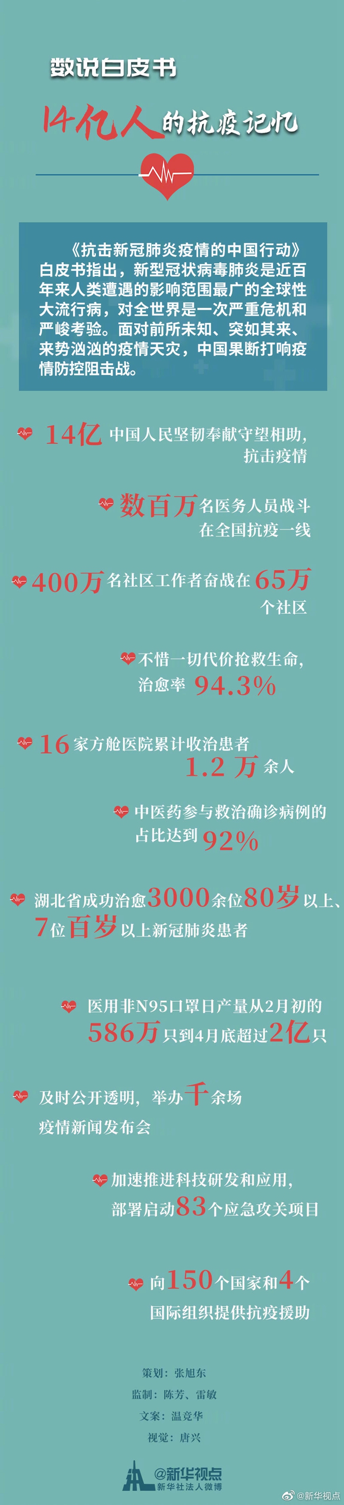 國務院新聞辦公室7日發布《抗擊新冠肺炎疫情的中國行動》白皮書,旨在記錄中國人民抗擊疫情的偉大歷程,與國際社會分享中國抗疫的經驗做法,闡明全球抗疫的中國理念、中國主張。白皮書中的一個個數字,凝結著14億國人共同的抗疫記憶。一起來回顧↓