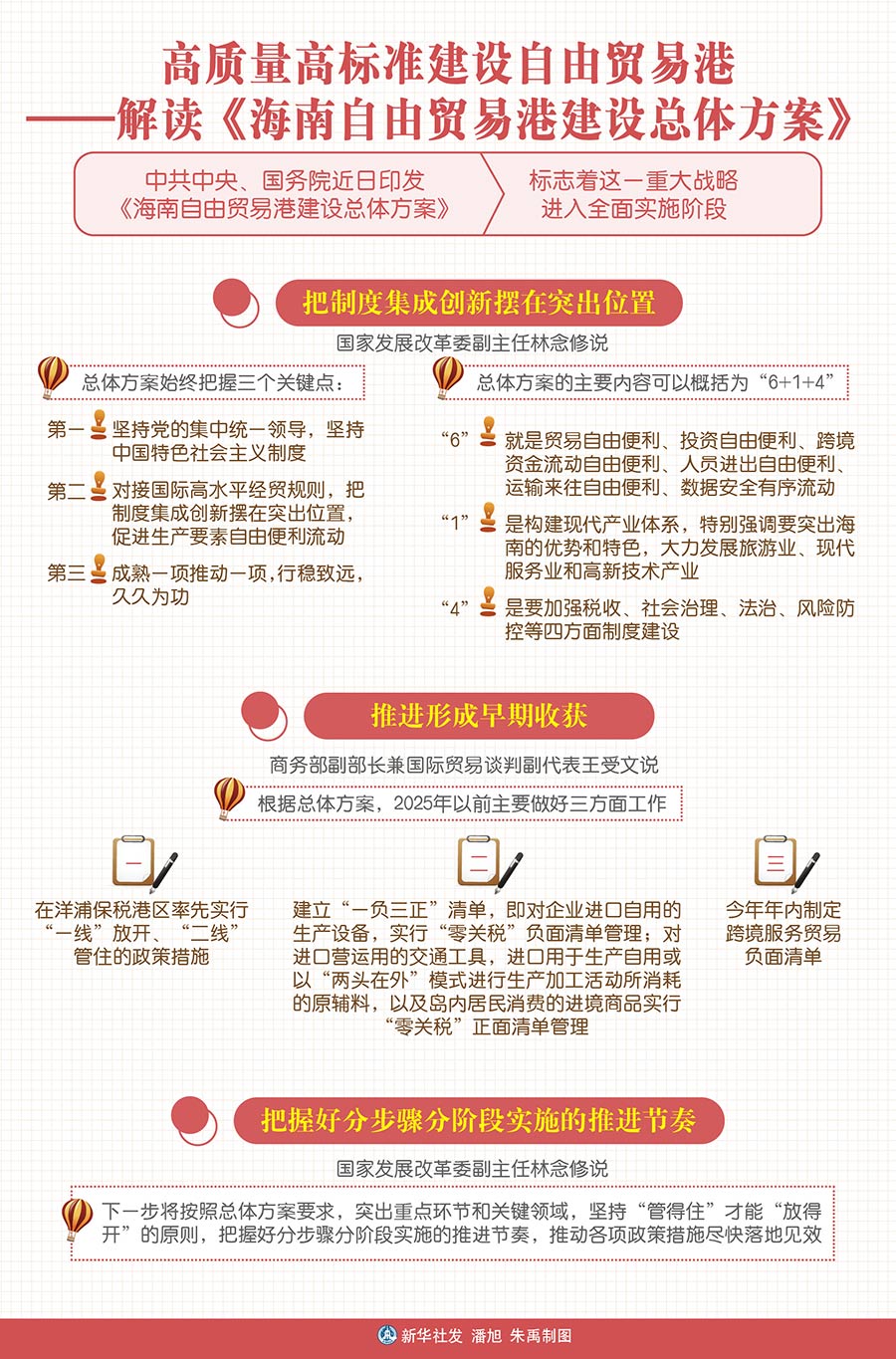 “總體方案始終把握三個關鍵點:第一,堅持黨的集中統一領導,堅持中國特色社會主義制度;第二,對接國際高水平經貿規則,把制度集成創新擺在突出位置,促進生產要素自由便利流動;第三,成熟一項推動一項,行穩致遠,久久為功。”國家發展改革委副主任林念修說。