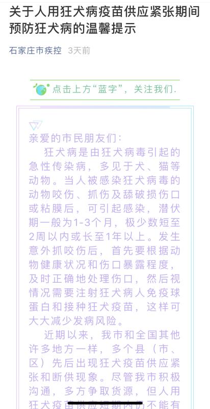 6月6日,石家莊市疾控中心發布了公告稱狂犬疫苗供應緊張。截圖
