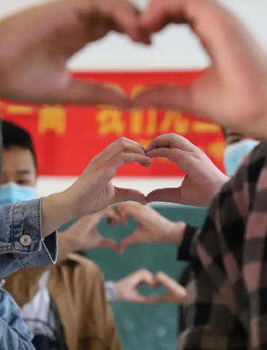 學生手比心形,感謝母親 馬玉 攝