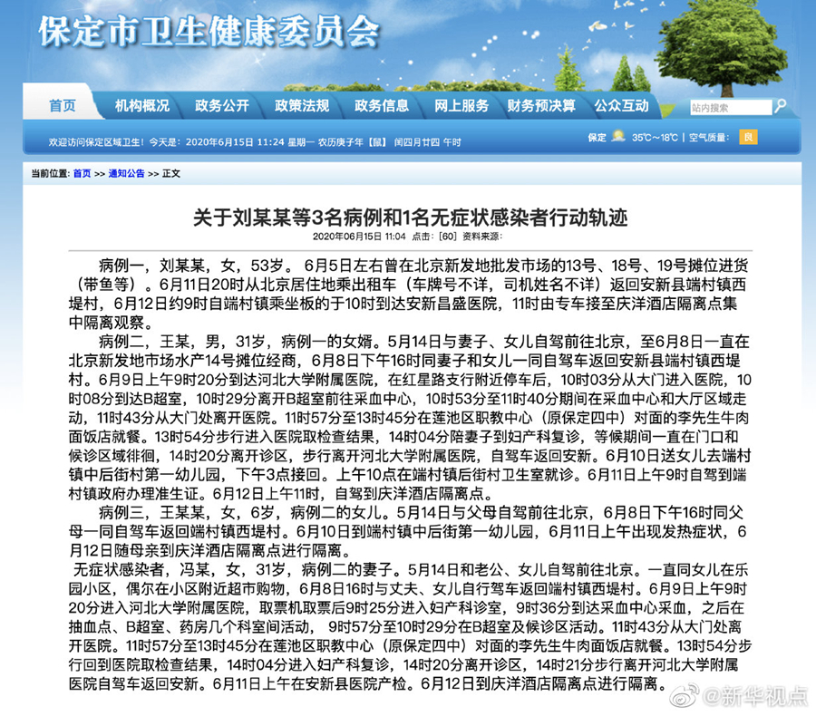 無癥狀感染者,馮某,女,31歲,病例二的妻子。5月14日和老公、女兒自駕前往北京。一直同女兒在樂園小區,偶爾在小區附近超市購物,6月8日16時與丈夫、女兒自行駕車返回端村鎮西堤村。6月9日上午9時20分進入河北大學附屬醫院,取票機取票后9時25分進入婦產科診室,9時36分到達采血中心采血,之后在抽血點、B超室、藥房幾個科室間活動, 9時57分至10時29分在B超室及候診區活動。11時43分從大門處離開醫院。11時57分至13時45分在保定市四職中對面的李先生牛肉面飯店就餐。13時54分步行回到醫院取檢查結果,14時04分進入婦產科復診,14時20分離開診區,14時21分步行離開河北大學附屬醫院自駕車返回安新。6月11日上午在安新縣醫院產檢。6月12日到慶洋酒店隔離點進行隔離。(記者秦婧、李繼偉)