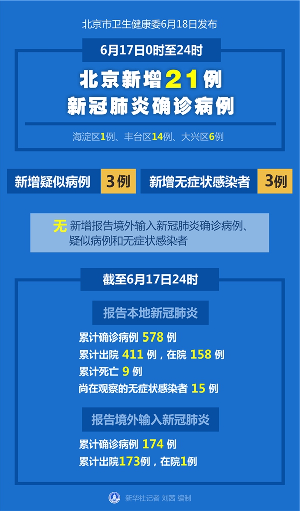 截至6月17日24時,北京市累計報告本地新冠肺炎確診病例578例,累計出院411例,在院158例,累計死亡9例,尚在觀察的無癥狀感染者15例;累計報告境外輸入確診病例174例,累計出院173例,在院1例。