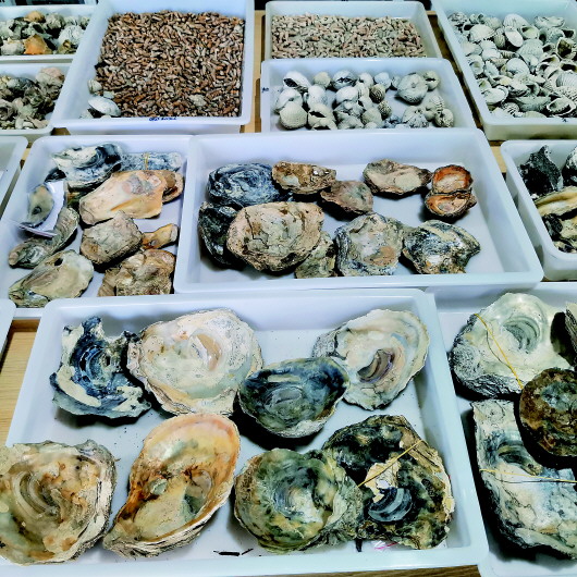 在這樣的環境下,先民們顯然先得靠海吃海。在基坑里,記者看到土層里夾雜著一層層的貝殼。在考古工地工作用房門外的走廊上,一排排裝滿各類貝殼的塑料箱摞了兩三層高。而在兩大間庫房里,各種海生貝類的貝殼擺了“好幾桌”,特別是那些巨大的牡蠣殼,大的足足有餐桌上的菜盆子那么大,由此想象一下,足以讓現代的老饕們垂涎三尺。