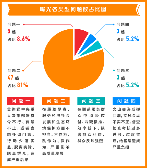 從具體問題類型看,“貫徹黨中央重大決策部署有令不行、有禁不止,或者表態(tài)多調(diào)門高、行動(dòng)少落實(shí)差,脫離實(shí)際、脫離群眾,造成嚴(yán)重后果”方面問題5起,占比8.6%;“在履職盡責(zé)、服務(wù)經(jīng)濟(jì)社會(huì)發(fā)展和生態(tài)環(huán)境保護(hù)方面不擔(dān)當(dāng)、不作為、亂作為、假作為,嚴(yán)重影響高質(zhì)量發(fā)展”方面問題47起,占比81%;“在聯(lián)系服務(wù)群眾中消極應(yīng)付、冷硬橫推、效率低下,損害群眾利益,群眾反映強(qiáng)烈”方面問題3起,占比5.2%;“文山會(huì)海反彈回潮,文風(fēng)會(huì)風(fēng)不實(shí)不正,督查檢查考核過多過頻、過度留痕,給基層造成嚴(yán)重負(fù)擔(dān)”方面問題3起,占比5.2%。