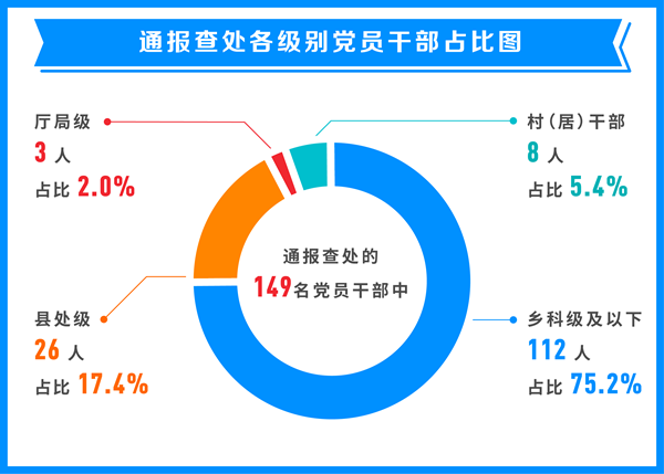 從處理各級(jí)別黨員干部人數(shù)看,通報(bào)的58起典型問題,查處的149名黨員干部中,村(居)干部8人,占全部人數(shù)5.4%;鄉(xiāng)科級(jí)及以下112人,占全部人數(shù)75.2%;縣處級(jí)26人,占全部人數(shù)17.4%;地廳級(jí)3人,占全部人數(shù)2.0%。通報(bào)數(shù)據(jù)印證,重點(diǎn)整治群眾身邊特別是群眾反映強(qiáng)烈的形式主義、官僚主義突出問題十分必要。