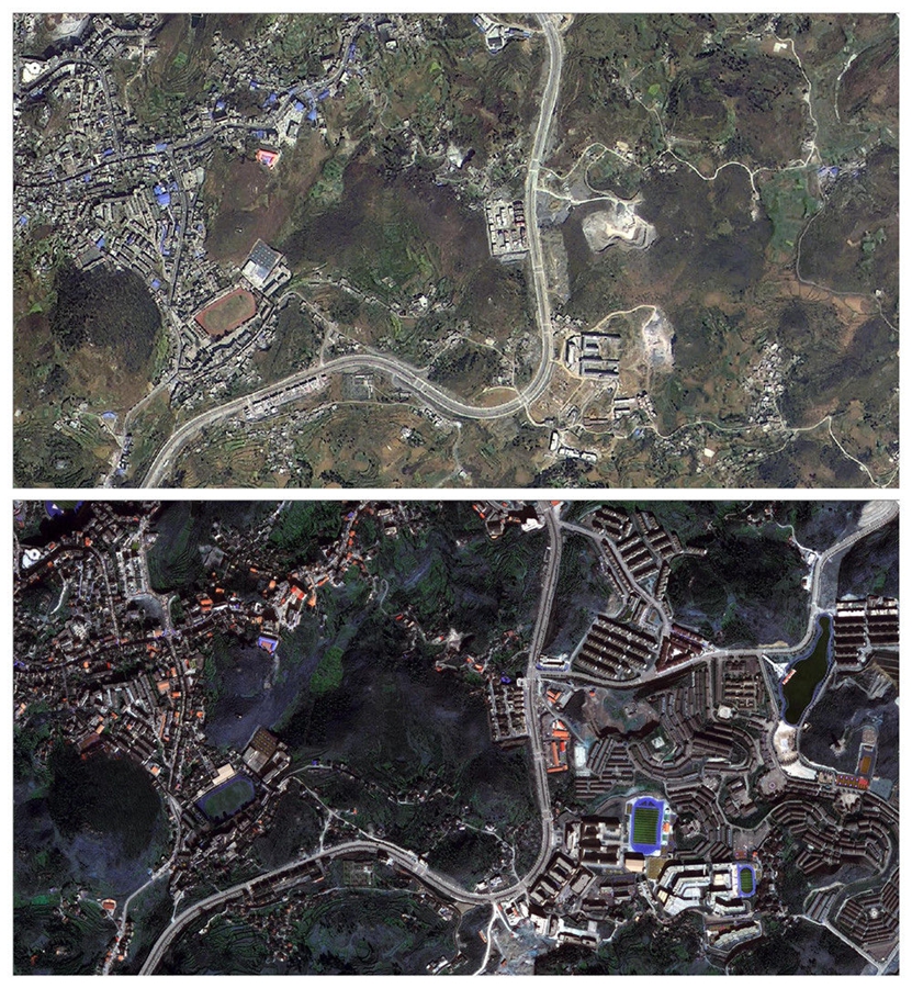 拼版照片的上圖為2015年建設前的貴州省晴隆縣三寶街道阿妹戚托小鎮衛星地圖截圖(以公路為界:右為阿妹戚托小鎮,左為晴隆縣城);下圖為2019年建設完成后的阿妹戚托小鎮衛星地圖截圖。新華社發(貴州省測繪資料檔案館供圖)