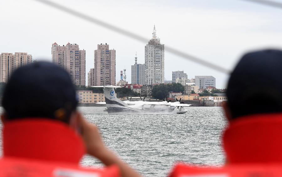 7月26日,水陸兩棲飛機AG600在日照山字河機場起飛。新華社記者 王凱 攝
